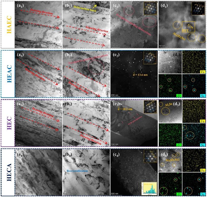 昆明理工大學(xué)黎振華團隊近年來聚焦綠色鋁、鈦等云南特色優(yōu)勢產(chǎn)業(yè),以服務(wù)國家特別是本土產(chǎn)業(yè)發(fā)展需求為導(dǎo)向,與北京航空航天大學(xué)馬朝利、肖文龍團隊合作,系統(tǒng)考察了加工路徑對鋁-鋯-鈧合金微觀組織與性能的影響,獲得了各工藝環(huán)節(jié)對合金組織、強度和導(dǎo)電率影響的定量關(guān)系。結(jié)果表明,通過快速凝固-熱變形-時效-冷拔路徑,充分利用細晶強化、析出強化、位錯強化和熱變形過程中鈧原子的動態(tài)析出,可獲得強度、導(dǎo)電率及耐熱性良好匹配的鋁-鋯-鈧合金導(dǎo)線。