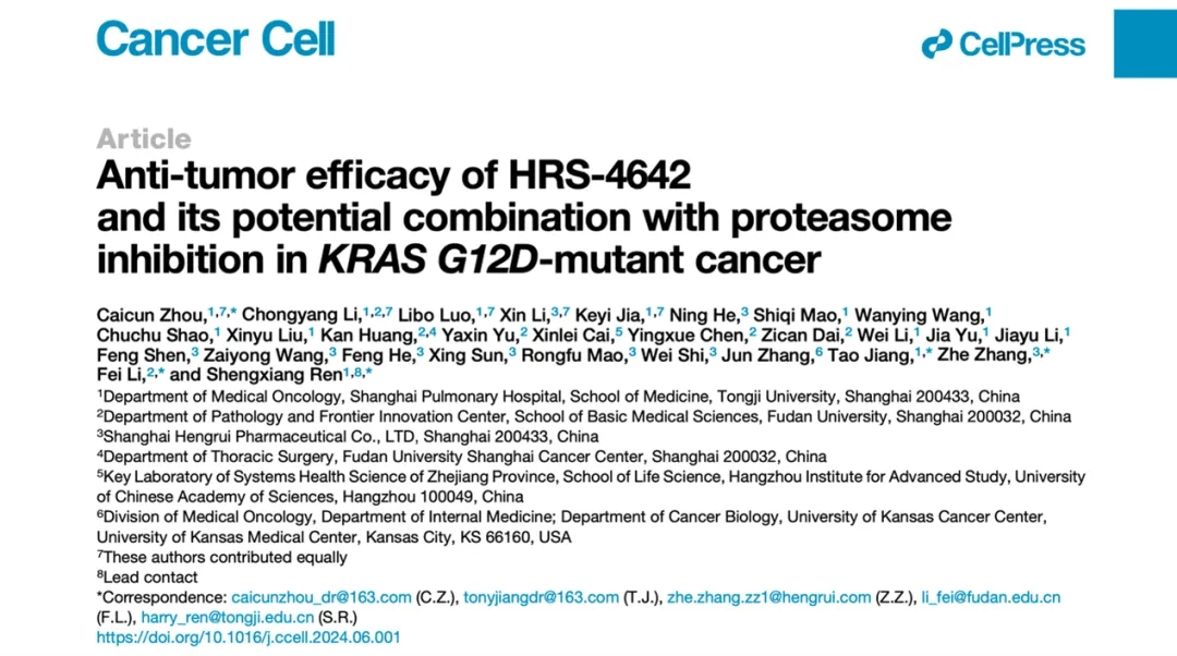 醫(yī)學(xué)院、附屬上海市肺科醫(yī)院任勝祥、周彩存團隊研發(fā)了首個臨床有效KRAS G12D特異性抑制劑——HRS-4642,通過體內(nèi)外聯(lián)合給藥實驗明確了其與蛋白酶體抑制劑聯(lián)合的治療新策略。研究團隊還通過流式細(xì)胞術(shù)、免疫組化等發(fā)現(xiàn)了HRS-4642單藥或聯(lián)合治療效用,為KRAS G12D腫瘤靶免聯(lián)合提供了理論基礎(chǔ)。該研究成果發(fā)表于《癌細(xì)胞》(Cancer Cell)。