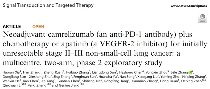 肺癌是全球發(fā)病和死亡人數(shù)最多的惡性腫瘤,其中非小細(xì)胞肺癌占比約85%。醫(yī)學(xué)院、附屬上海市肺科醫(yī)院胸外科姜格寧、張鵬團隊聯(lián)合市內(nèi)六家醫(yī)療單位共同開展了一項名為LungMate 003的多中心、雙臂、開放、Ⅱ期臨床研究,旨在探究新輔助卡瑞利珠單抗聯(lián)合化療或阿帕替尼治療初始不可切除非小細(xì)胞肺癌患者的安全性和有效性。該研究成果發(fā)表于《信號轉(zhuǎn)導(dǎo)與靶向治療》(Signal Transduction and Targeted Therapy)。