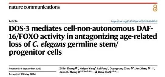 全球老齡化不斷加劇,如何延緩衰老、促進健康衰老,需要對衰老這一生理過程進行更深入的探索。醫(yī)學(xué)院、附屬同濟醫(yī)院秦昭、鄭加麟、相俊團隊研究發(fā)現(xiàn)一個非經(jīng)典的Notch配體DOS-3介導(dǎo)PSG細(xì)胞中的DAF-16/FOXO活性以拮抗線蟲生殖干細(xì)胞隨年齡的衰減,研究對于解析生殖衰老和干細(xì)胞衰老的機制具有廣泛意義。該研究成果發(fā)表于《自然·通訊》(Nature Communications)。