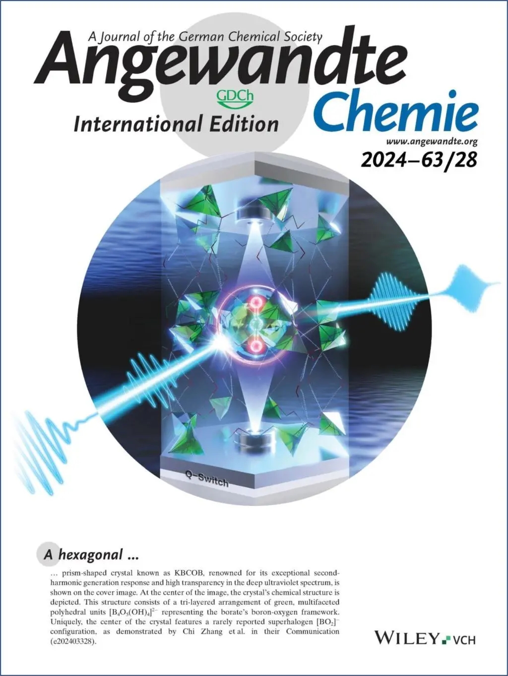 化學(xué)科學(xué)與工程學(xué)院張弛研究團隊以鹵代氧化物為研究對象,提出了一種超鹵素取代設(shè)計方法,研制了首例含有[BO2]基元的深紫外透過的氧化物晶體材料K9[B4O5(OH)4]3(CO3)(BO2)·7H2O (KBCOB),探討并闡明了多種π共軛陰離子基元對晶體材料光學(xué)帶隙、倍頻效應(yīng)以及雙折射率的影響規(guī)律。相關(guān)成果發(fā)表于《德國應(yīng)用化學(xué)》(Angewandte Chemie International Edition),并被遴選為封面文章。