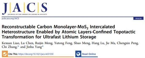 二維材料的插層結(jié)構(gòu)設(shè)計對發(fā)展快速充電鋰離子電池具有重要意義?;瘜W(xué)科學(xué)與工程學(xué)院楊金虎與張弛團隊設(shè)計了一種單層碳插層在二硫化鉬范德華層間的異質(zhì)結(jié)構(gòu)材料,作為負(fù)極材料在鋰離子電池儲能過程中具有獨特的“原子層限域拓?fù)浞磻?yīng)”和可逆重構(gòu)的特性,并展現(xiàn)出了超快充性能。相關(guān)研究成果發(fā)表于《美國化學(xué)會志》(Journal of the American Chemical Society)。