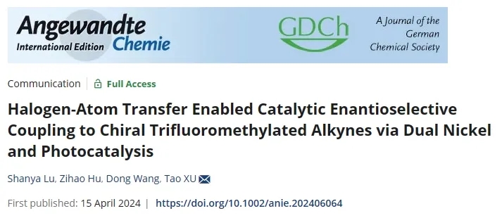 手性α-CF3炔烴化是一類非常重要的合成,在化學(xué)合成、藥物開發(fā)等領(lǐng)域有著獨特而顯著的作用?;瘜W(xué)科學(xué)與工程學(xué)院徐濤課題組利用鹵原子轉(zhuǎn)移策略實現(xiàn)手性α-CF3炔烴高效構(gòu)建的新方法,進一步證明了光鎳雙催化不對稱還原偶聯(lián)體系的優(yōu)勢,為后續(xù)實現(xiàn)醇的不對稱去氧偶聯(lián)反應(yīng)奠定基礎(chǔ)。相關(guān)研究成果在線發(fā)表于《德國應(yīng)用化學(xué)》(Angewandte Chemie International Edition)。