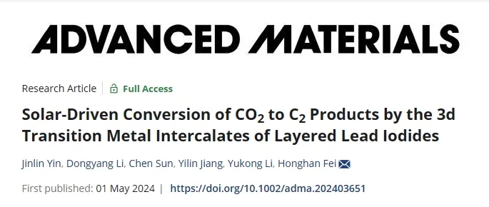 模仿自然界中的光合作用,利用人工合成的光催化劑將CO2光還原到高附加值的C2+化學(xué)品,具有重要的科學(xué)意義?;瘜W(xué)科學(xué)與工程學(xué)院費泓涵課題組通過配位組裝策略,將具有氧化還原活性的3d過渡金屬(Co2+/Ni2+)插層至準(zhǔn)二維層狀配位型有機碘化鉛的相鄰層間,實現(xiàn)高選擇性光催化CO2得到C2產(chǎn)物。相關(guān)研究成果發(fā)表于《先進材料》(Advanced Materials)。