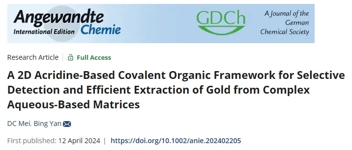 金作為最重要的金屬之一,在電子、航空航天和化學(xué)催化等重要領(lǐng)域都具有不可替代的地位?;瘜W(xué)科學(xué)與工程學(xué)院閆冰團隊合成了一例亞胺鍵連接的吖啶基共價有機框架(COF)材料,該材料能夠作為新型探針實現(xiàn)對金離子的選擇性熒光傳感、比色傳感和高效的提取。相關(guān)研究成果在線發(fā)表于《德國應(yīng)用化學(xué)》(Angewandte Chemie International Edition)。