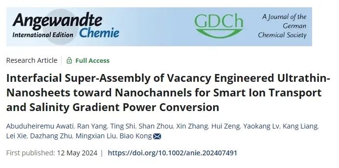 滲透能作為一種“藍(lán)色能源”,即利用淡水和含鹽水之間的離子濃度差異來獲取能量,被認(rèn)為是解決能源危機和環(huán)境問題的潛在方案?;瘜W(xué)科學(xué)與工程學(xué)院劉明賢課題組提出了一種基于缺陷工程調(diào)控表面電荷策略,通過界面超組裝智能調(diào)控離子傳輸,實現(xiàn)了滲透能發(fā)電。近日,相關(guān)研究成果發(fā)表于《德國應(yīng)用化學(xué)》(Angewandte Chemie International Edition)。