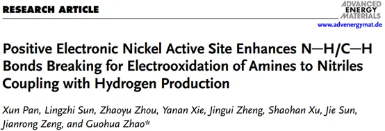 氫能有望成為化石燃料的理想替代品,但是陽極處緩慢的析氧反應(yīng)極大地抑制了電解水制氫的效率?;瘜W(xué)科學(xué)與工程學(xué)院趙國華團隊發(fā)展了一種促進N-H/C-H鍵斷裂以實現(xiàn)高效電解水制氫的方法,實現(xiàn)了電氧化胺到腈的完全轉(zhuǎn)化并達(dá)到99%以上的選擇性,達(dá)到資源和能源的雙重利用。相關(guān)研究成果發(fā)表于《先進能源材料》(Advanced Energy Materials)。