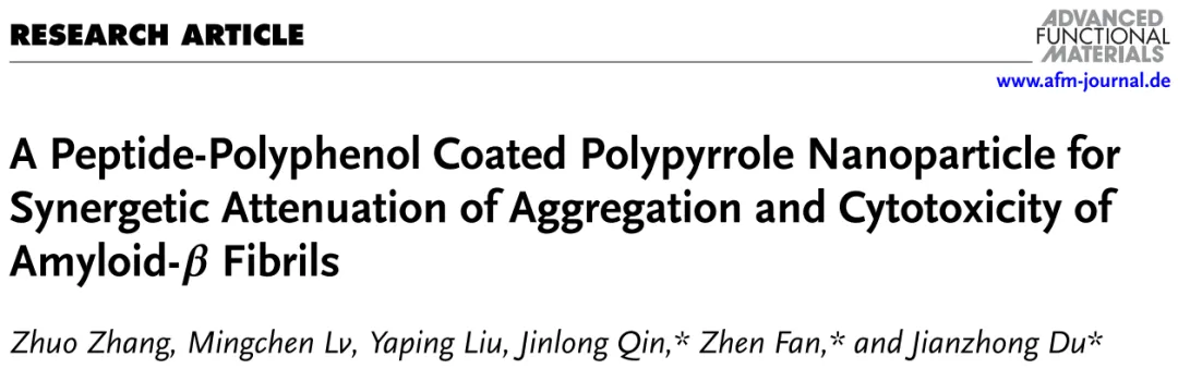 如何有效抑制大腦中β-淀粉樣蛋白(amyloid-β protein,Aβ)的聚集并解離已經(jīng)聚集的Aβ斑塊,是阿爾茨海默病治療領(lǐng)域的關(guān)鍵科學(xué)問題。材料科學(xué)與工程學(xué)院杜建忠/范震課題組設(shè)計并制備了一種具有多肽-多酚殼層的近紅外光響應(yīng)性納米顆粒,能夠有效促進和加速Aβ纖維的解離。該研究成果發(fā)表于《先進功能材料》(Advanced Functional Materials)。
