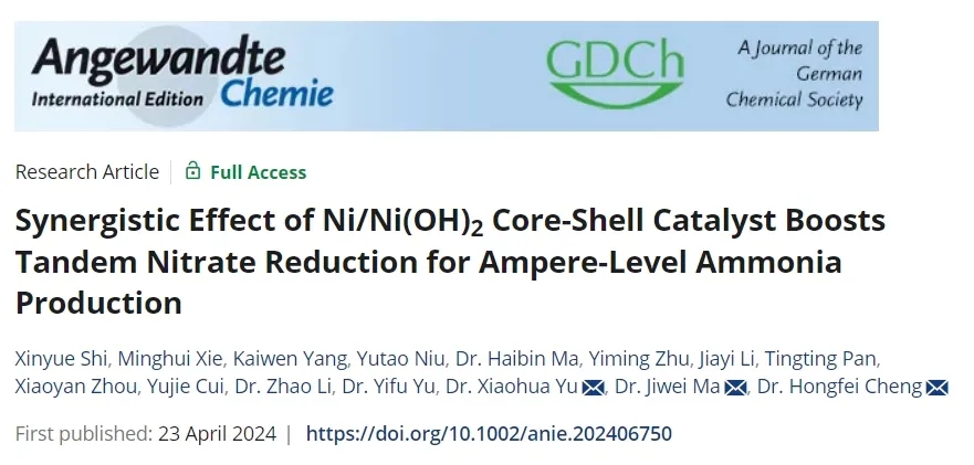 氨是重要的氮肥來源,也是清潔燃料。電催化硝酸鹽還原制氨被認(rèn)為是最有望替代哈伯法的綠色制氨技術(shù),設(shè)計高活性和高選擇性的催化劑是實現(xiàn)高效電催化硝酸鹽制氨的關(guān)鍵。材料科學(xué)與工程學(xué)院程洪飛課題組合成了具備核殼異質(zhì)結(jié)構(gòu)的Ni/Ni(OH)2催化劑,實現(xiàn)了安培級電流密度的制氨。相關(guān)研究成果發(fā)表于《德國應(yīng)用化學(xué)》(Angewandte Chemie International Edition)。