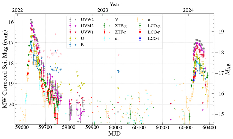 圖1:紫外與光學多波段的光變曲線,倒三角表示探測的上限。2022年,第一次耀發(fā)出現(xiàn),隨后消散以至不可辨認;2年之后,同一位置再次出現(xiàn)相似的耀發(fā)。