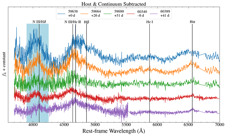 圖2:光譜的發(fā)射線輪廓。從上至下前三條光譜與后兩條光譜分別于第一次、第二次耀發(fā)期間拍攝。涂藍色的區(qū)域表示兩次耀發(fā)中極其相似的NIII特征譜線。該譜線可通過電離恒星被瓦解后釋放出的物質(zhì)來產(chǎn)生,其重復出現(xiàn)表明TDE再次發(fā)生,而相似的輪廓和強度則暗示參與其中的很可能是同一顆恒星。