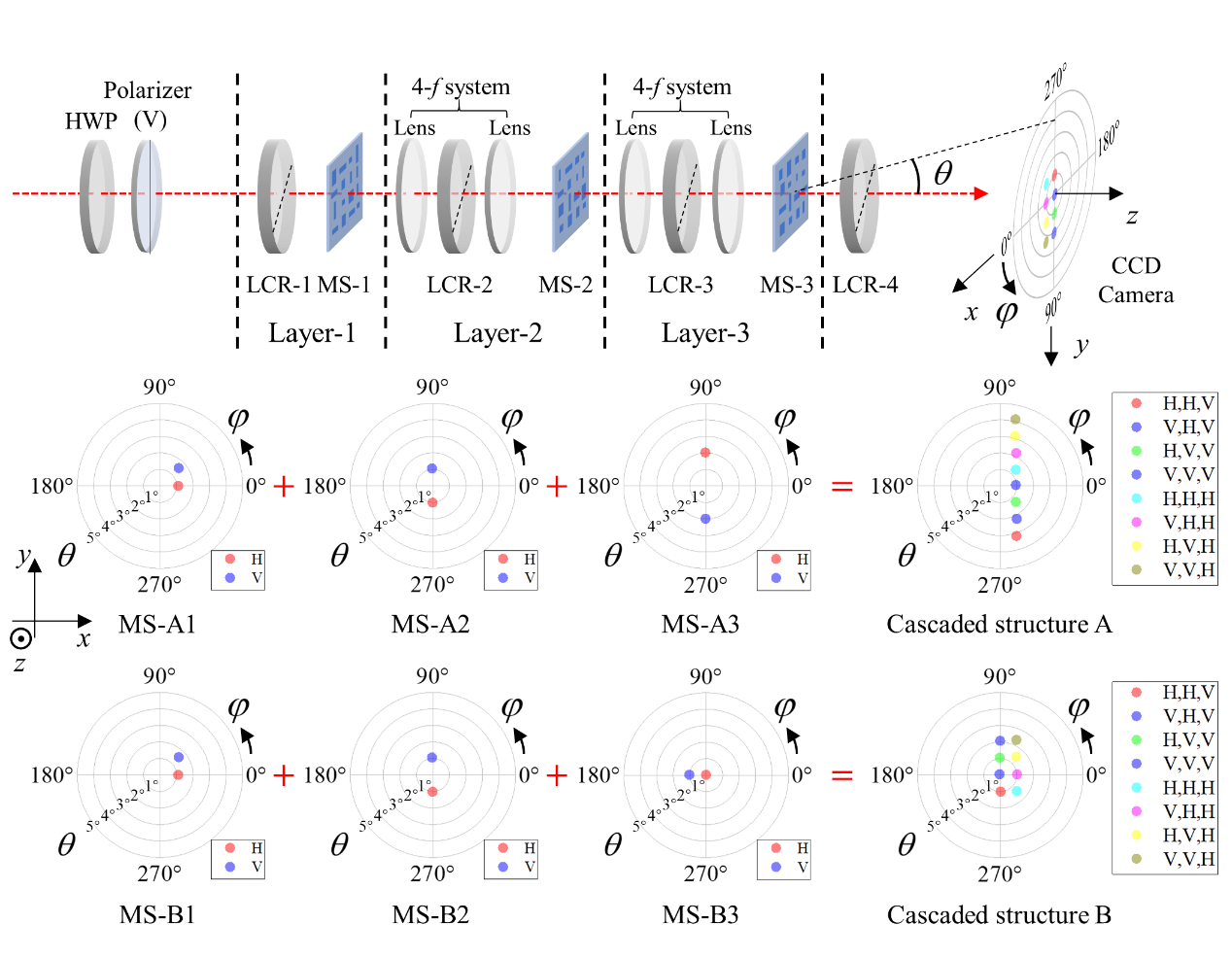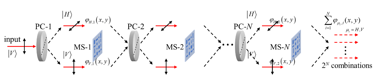 為了提升通道數(shù)量,研究團(tuán)隊采用N個偏振相關(guān)超表面進(jìn)行級聯(lián),同時在每個超表面前增加一個偏振控制器,使得該超表面的輸入光可在2個正交偏振態(tài)間切換。此時,整個級聯(lián)結(jié)構(gòu)中的光偏振態(tài)將具有2N種組合,對應(yīng)的等效波前操控模板也具有2N種情況。然而,這些模板間具有相關(guān)性,自由度僅為N+1,無法對應(yīng)2N個任意的功能進(jìn)行設(shè)計。
