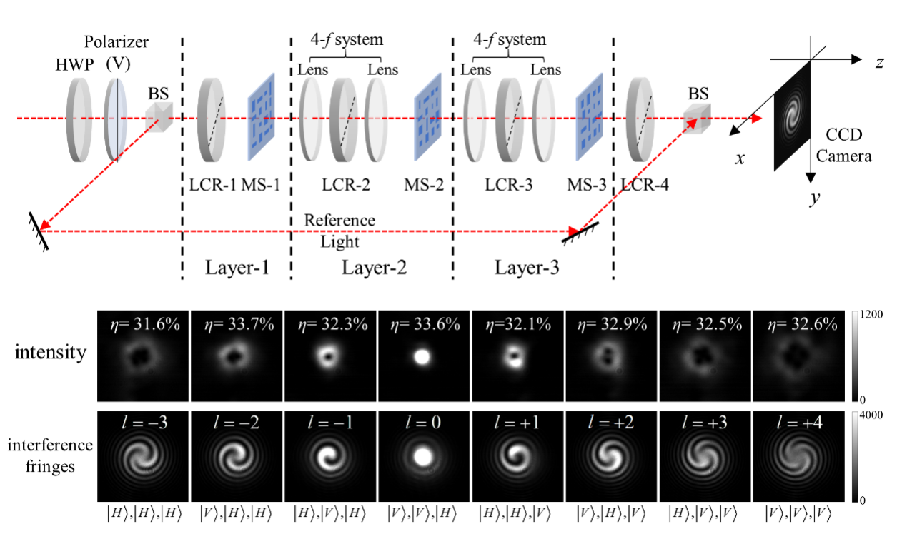 實驗上,研究團(tuán)隊通過3層超表面的級聯(lián)架構(gòu)實現(xiàn)了8通道可調(diào)階次的渦旋光束產(chǎn)生以及8通道動態(tài)波束偏轉(zhuǎn),對上述方案進(jìn)行了驗證?;诓煌某砻婕壜?lián)組合,渦旋光束的拓?fù)浜蓴?shù)(topological charge, TC)可在l=-3~+4或l=-1~-8間切換,前者效率在31.6%~33.7%范圍內(nèi)。波束偏轉(zhuǎn)的方向可按8×1一維排列或4×2二維排列,效率均在15%~25%范圍內(nèi)。同時,所使用的偏振控制器均為可電調(diào)的液晶偏振延遲器(liquid crystal phase retarder),因此該實驗架構(gòu)可以電調(diào)切換通道。