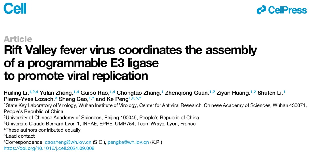 近日,中國(guó)科學(xué)院大學(xué)(以下簡(jiǎn)稱“國(guó)科大”)博士生導(dǎo)師、中國(guó)科學(xué)院武漢病毒研究所(以下簡(jiǎn)稱“武漢病毒所”)研究員彭珂、曹晟團(tuán)隊(duì)在Cell上發(fā)表了題為“Rift Valley fever virus coordinates the assembly of a programmable E3-ligase to promote viral replication”的研究論文。該研究揭示了裂谷熱病毒非結(jié)構(gòu)蛋白NSs重塑宿主E3泛素連接酶系統(tǒng)性抑制宿主抗病毒免疫的致病新機(jī)制。國(guó)科大2021級(jí)生物化學(xué)與分子生物學(xué)專業(yè)博士生李慧玲,武漢病毒所實(shí)驗(yàn)師張玉蘭、饒桂波為共同第一作者。