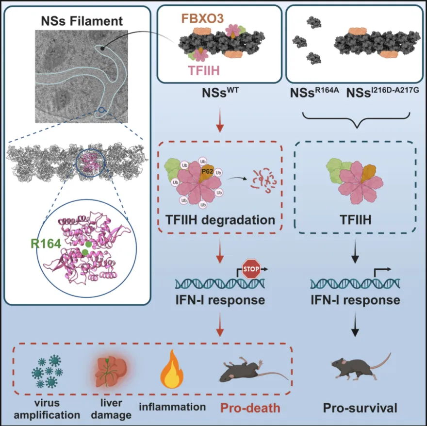 文章模式圖:NSs蛋白重塑的FBXO3-NSs filament介導(dǎo)TFIIH復(fù)合體降解,系統(tǒng)性拮抗宿主IFN-I反應(yīng),促進(jìn)RVFV感染致病
