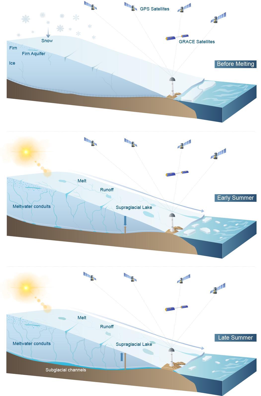另外,儲存在冰蓋內(nèi)部和底部的融水量很大,能把測站附近的基巖最高壓低5毫米,這對建立和維持毫米級全球高程基準具有重要的影響。