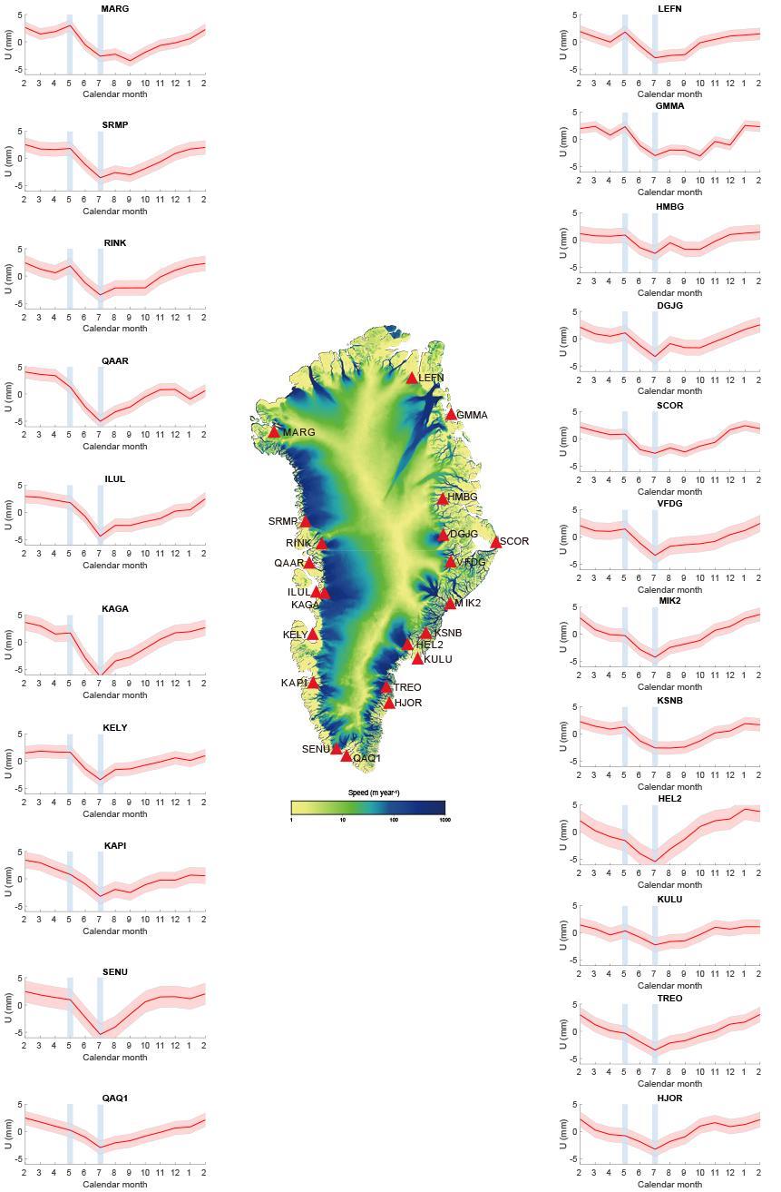近日,南方科技大學(xué)地球與空間科學(xué)系冉將軍副教授課題組與國際團隊合作,在研究冰川融化機制方面取得新進展。研究團隊利用全球衛(wèi)星導(dǎo)航系統(tǒng)首次揭示了融水在格陵蘭冰蓋內(nèi)部和底部的演化(圖1),相關(guān)成果以“Vertical bedrock shifts reveal summer water storage in Greenland ice sheet”為題發(fā)表在頂級學(xué)術(shù)期刊《自然》(Nature)上。