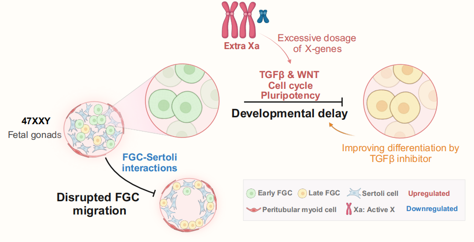 該研究以導(dǎo)致男性不育最常見(jiàn)的性染色體疾病——克氏綜合征(核型47,XXY)為代表,系統(tǒng)揭示了額外的X染色體導(dǎo)致男性胎兒生殖細(xì)胞(Fetal germ cell, FGC)發(fā)育異常的分子機(jī)制,并且發(fā)現(xiàn)了改善該類(lèi)患者生殖障礙的潛在干預(yù)策略,為其不育癥的早期治療提供了理論依據(jù)。