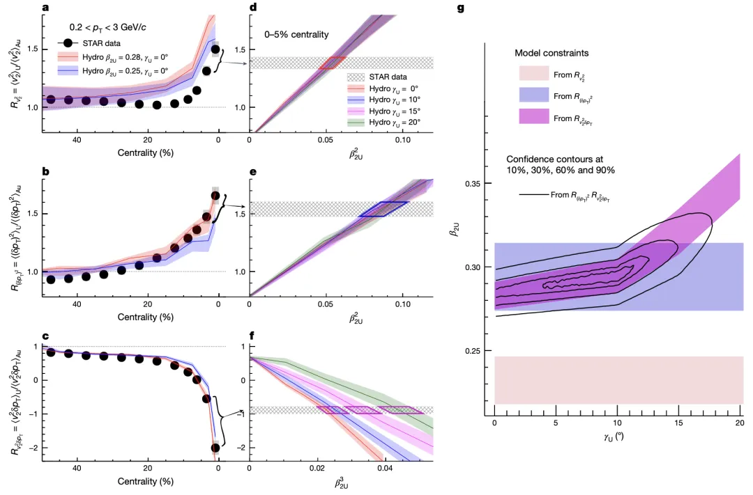 在《自然》論文中,馬余剛院士團(tuán)隊(duì)與合作者在STAR實(shí)驗(yàn)組以接近球形的金核-金核碰撞為基準(zhǔn),精準(zhǔn)成像原子核結(jié)構(gòu)特征,定量提取了鈾核-鈾核碰撞中鈾-238原子核的四極軸對(duì)稱形變(β2)和三軸形變(γ)結(jié)構(gòu)信息。