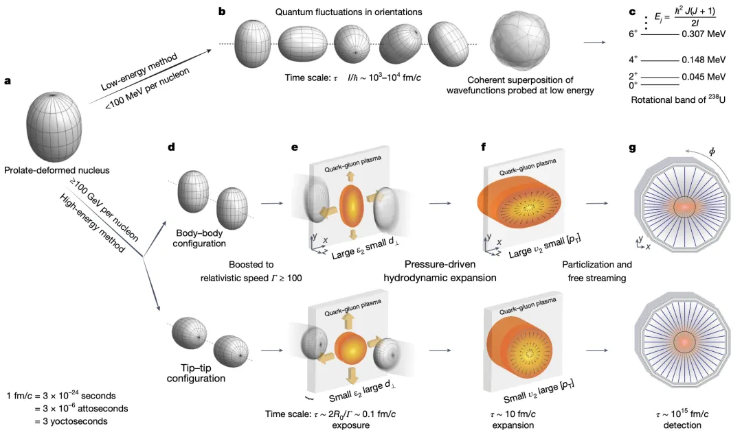 相比之下,相對(duì)論重離子碰撞在成像原子核結(jié)構(gòu)研究方面具有獨(dú)特性。如圖2所示,相對(duì)論能量下,原子核會(huì)發(fā)生洛倫茲收縮,相互作用持續(xù)時(shí)間為幺秒尺度(約 10-24 秒),遠(yuǎn)低于實(shí)驗(yàn)室系下原子核量子漲落的時(shí)間尺度 (約 10-21 秒),甚至比2023年諾貝爾物理學(xué)獎(jiǎng)研究物質(zhì)電子動(dòng)力學(xué)的阿秒激光脈沖小六個(gè)量級(jí)。具有奇特結(jié)構(gòu)的原子核在極端中心對(duì)撞區(qū)間會(huì)呈現(xiàn)不同的碰撞構(gòu)型,這將影響初態(tài)能量沉積以及能量密度分布在QGP幾何空間中的各向異性分布。