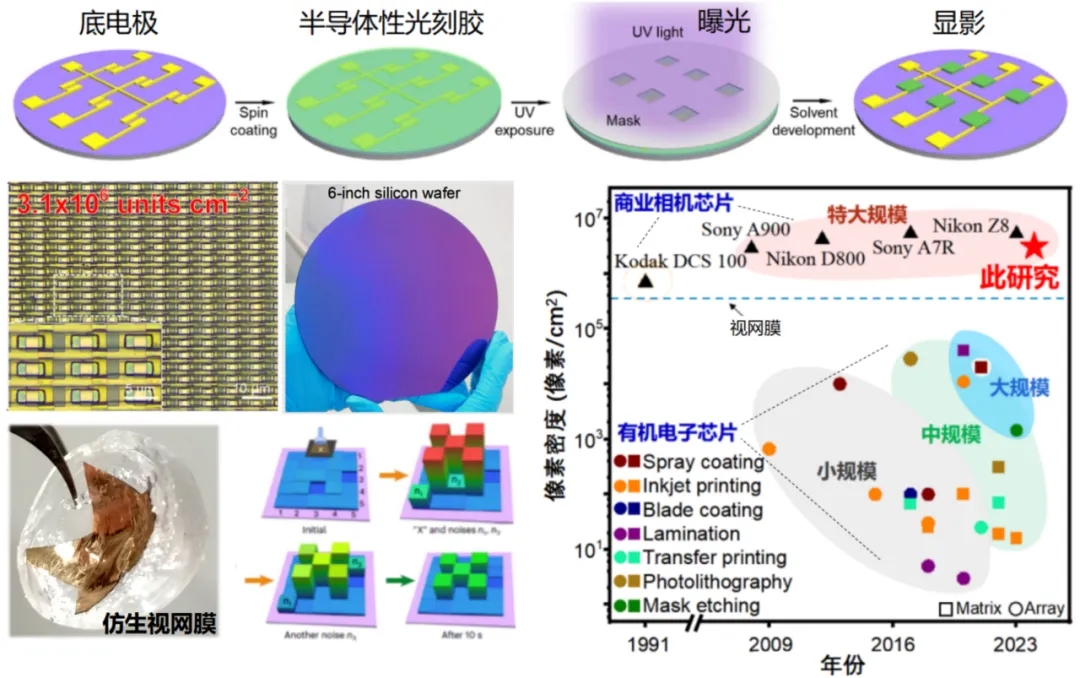 提出了“全光刻有機電子技術路線”,突破了高集成有機芯片可靠制造瓶頸。團隊發(fā)展了納米互穿網絡聚集態(tài)結構設計原理,研發(fā)了該路線的核心原材料“半導體性光刻膠”,制造出全球首款特大規(guī)模集成度聚合物半導體芯片,是目前聚合物半導體芯片的最高集成度。該芯片應用于柔性仿生視網膜,具有與人眼視網膜相當?shù)墓忭憫取⑾袼孛芏群凸囊约氨壬逃肅MOS芯片更高的圖像識別準確率。相關成果2024年發(fā)表于Nature Nanotechnology,并被News&Views專欄亮點報道,認為該工作“開發(fā)了一項推動有機集成光電子學發(fā)展的晶圓級、可靠、標準化制造技術”。