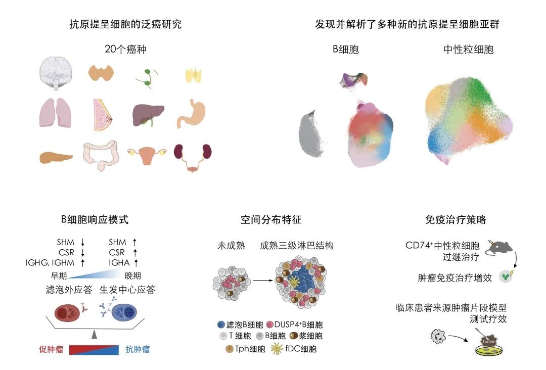 發(fā)現(xiàn)并解析了新的抗原提呈細胞亞群,突破了腫瘤免疫治療領域對B細胞和中性粒細胞的傳統(tǒng)認知,為提高免疫治療的精準性與療效提供了革命性思路。研究團隊發(fā)現(xiàn)并深入解析了包括DUSP4+ B細胞和HLA-DR+CD74+中性粒細胞在內的新型抗原提呈細胞亞群,并提出通過改造抗原提呈中性粒細胞促進“熱腫瘤”微環(huán)境形成的新策略。該研究瞄準了腫瘤免疫治療中個體差異和療效有限的痛點,為精準免疫治療提供了關鍵理論支撐和技術方向。成果于2024年發(fā)表在Cell和Science,同時獲Science、Nature Reviews、Cell等50余家媒體和權威期刊的關注。