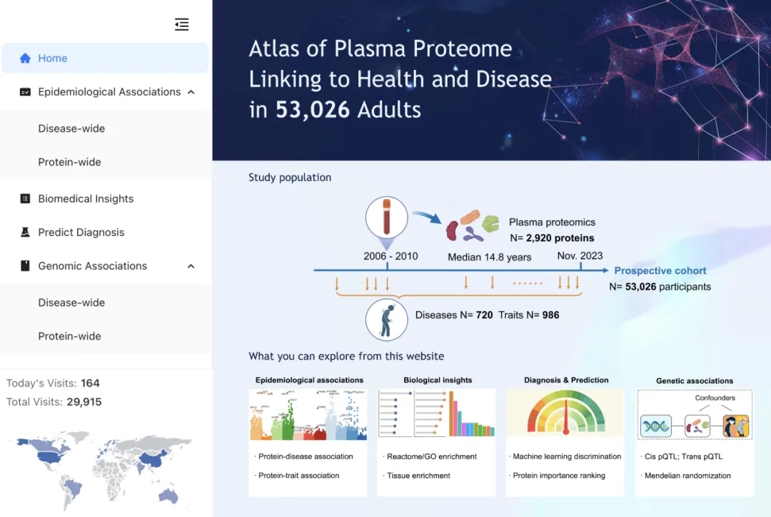 繪制了迄今為止最為全面的蛋白質組圖譜,為183種疾病構建了精度良好的預測診斷模型,并發(fā)現(xiàn)了26個潛在治療新靶點。大規(guī)模蛋白質組學研究能夠深化我們對健康和疾病的理解。研究團隊繪制了迄今為止最為全面的蛋白質組圖譜,為183種疾病構建了極具潛力的預測診斷模型,并發(fā)現(xiàn)了26個潛在治療新靶點,為精準醫(yī)學奠定了基礎,并建立了可開放訪問的蛋白質組-表型組資源數(shù)據(jù)庫,網站上線一個月訪問量近3萬。論文已于2024年11月22日在Cell雜志發(fā)表。
