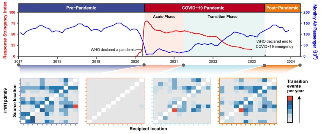 揭示全球大流行事件如何重塑全球季節(jié)性流感的傳播,為未來季節(jié)性流感的精準防控奠定基礎。研究團隊識別了大流行事件中季節(jié)性流感的全球流行特征和傳播關鍵區(qū)域,首次定量闡明了大流行后流感傳播模式的穩(wěn)健恢復,為季節(jié)性流感防控方案的制定提供了關鍵證據(jù)。相關成果于2024年發(fā)表在Science,同期配發(fā)專家述評。
