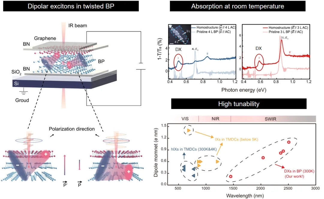 發(fā)現(xiàn)全新“明亮”偶極激子,為光學觀測量子世界打開一扇窗。研究團隊在轉角黑磷同質結中發(fā)現(xiàn)了一種新型偶極激子。這類激子源于獨特的能帶結構,無需依賴隧穿效應即可實現(xiàn)顯著的光吸收,突破了偶極激子與光相互作用能力弱的瓶頸問題,同時賦予其全新的調控維度。該發(fā)現(xiàn)為探索強關聯(lián)態(tài)、多體量子物理和非線性光學等基礎研究提供了理想平臺。相關成果發(fā)表在Science,并獲同期Science “視角”欄目評述文章的高度評價。