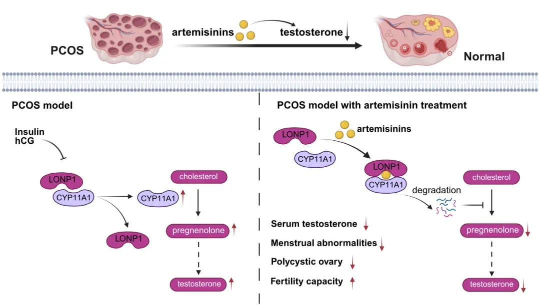 提出了青蒿素治療多囊卵巢綜合征的新策略。多囊卵巢綜合征(PCOS)是復雜的生殖內分泌和代謝性疾病,是女性不排卵性不孕的主要誘因,臨床治療缺乏特效藥。研究團隊揭示了青蒿素在治療PCOS中的創(chuàng)新性作用,發(fā)現(xiàn)青蒿素通過靶向線粒體蛋白酶LONP1抑制卵巢雄激素合成。臨床實驗證實青蒿素能夠同時改善PCOS的三大核心癥狀,與現(xiàn)有藥物相比具有顯著優(yōu)勢。研究成果于2024年發(fā)表在Science 期刊,獲Science及Nature Reviews Endocrinology等期刊亮點推薦。本研究為PCOS的臨床治療開辟了全新方向,有望突破臨床缺乏特效藥的瓶頸。