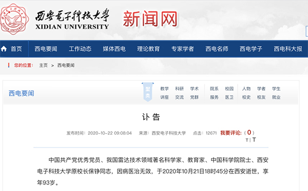據(jù)西安電子科技大學(xué)消息,我國(guó)雷達(dá)技術(shù)領(lǐng)域著名科學(xué)家、中國(guó)科學(xué)院院士、西安電子科技大學(xué)原校長(zhǎng)保錚,因病醫(yī)治無(wú)效,于2020年10月21日18時(shí)45分在西安逝世,享年93歲。