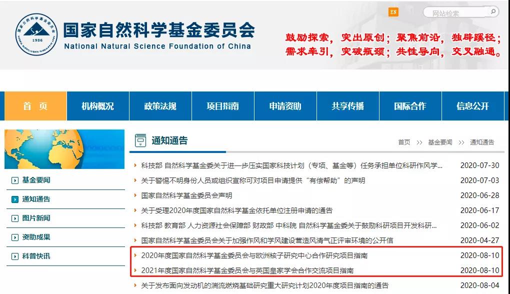 8月10日,國家自然科學(xué)基金委官網(wǎng)發(fā)布了2020年度與歐洲核子研究中心合作研究項(xiàng)目指南和2021年度與英國皇家學(xué)會(huì)合作交流項(xiàng)目指南。在最新發(fā)布的這兩批項(xiàng)目中,國家自然科學(xué)基金擬對與歐洲核子研究中心合作研究項(xiàng)目,給予單項(xiàng)最高1000萬元人民幣的直接費(fèi)用資助。