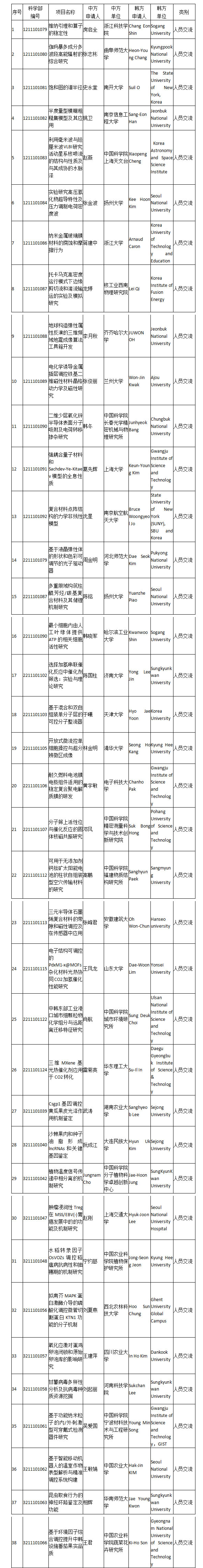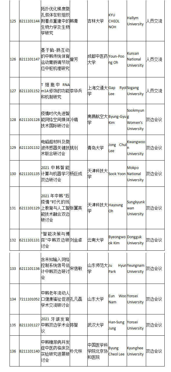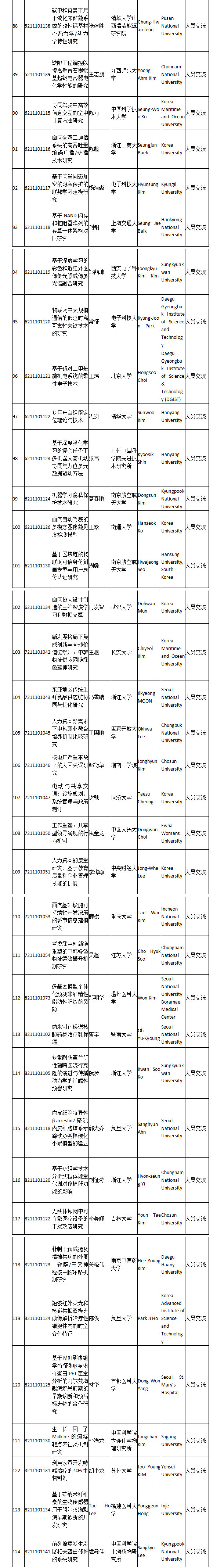 5月18日,國家自然科學(xué)基金委員會公布2021年度國家自然科學(xué)基金委員會與韓國國家研究基金會合作交流項目初審結(jié)果。根據(jù)國家自然科學(xué)基金委員會(NSFC)與韓國國家研究基金會(NRF)合作諒解備忘錄,雙方每年共同資助合作交流項目,其中包括人員交流、在境內(nèi)舉辦雙(多邊)會議、出國(境)參加雙(多)邊會議三類項目。經(jīng)雙方協(xié)商,2021年度將共同資助合作交流項目30項,其中人員交流項目20項,在境內(nèi)舉辦雙(多邊)會議及出國(境)參加雙(多)邊會議共10項。 本項目資助領(lǐng)域為自然科學(xué)相關(guān)領(lǐng)域,其中,中方資助強度為不超過15萬元/項。經(jīng)公開征集,共收到153項申請。經(jīng)初步審查并與韓方核對清單,共有136項申請通過初審,其中人員交流項目127項,雙邊會議項目9項。現(xiàn)將通過初審的項目申請公布如下: