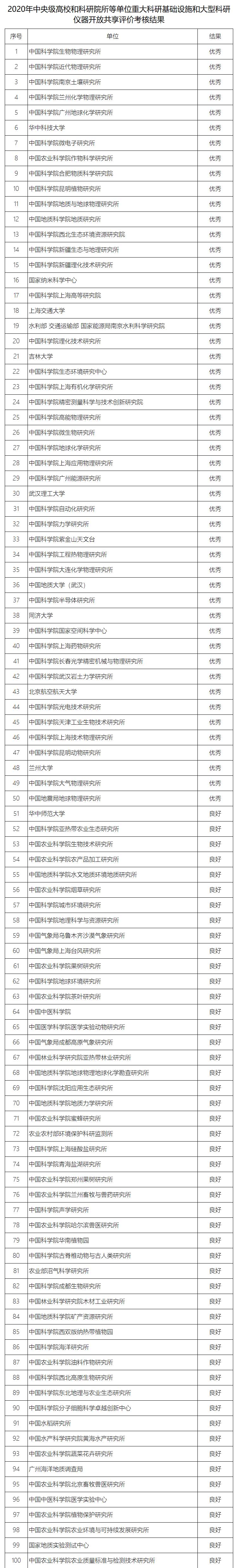 附件:2020年中央級高校和科研院所等單位重大科研基礎設施和大型科研儀器開放共享評價考核結果