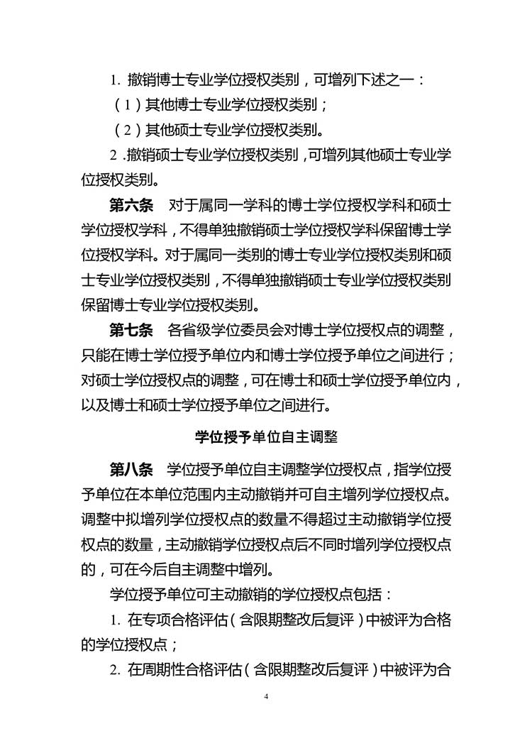 為貫徹落實(shí)全國研究生教育會(huì)議精神,進(jìn)一步完善學(xué)位授權(quán)點(diǎn)動(dòng)態(tài)調(diào)整機(jī)制,加強(qiáng)省級(jí)統(tǒng)籌,推動(dòng)學(xué)位授予單位根據(jù)經(jīng)濟(jì)社會(huì)發(fā)展需求、建設(shè)高質(zhì)量教育體系要求和自身辦學(xué)特色與學(xué)科專業(yè)水平,主動(dòng)調(diào)整優(yōu)化學(xué)位授權(quán)點(diǎn)結(jié)構(gòu),提升研究生教育質(zhì)量,經(jīng)國務(wù)院學(xué)位委員會(huì)第三十六次會(huì)議審議批準(zhǔn),現(xiàn)將修訂后的《博士、碩士學(xué)位授權(quán)學(xué)科和專業(yè)學(xué)位授權(quán)類別動(dòng)態(tài)調(diào)整辦法》印發(fā)給你們,請(qǐng)遵照?qǐng)?zhí)行。
